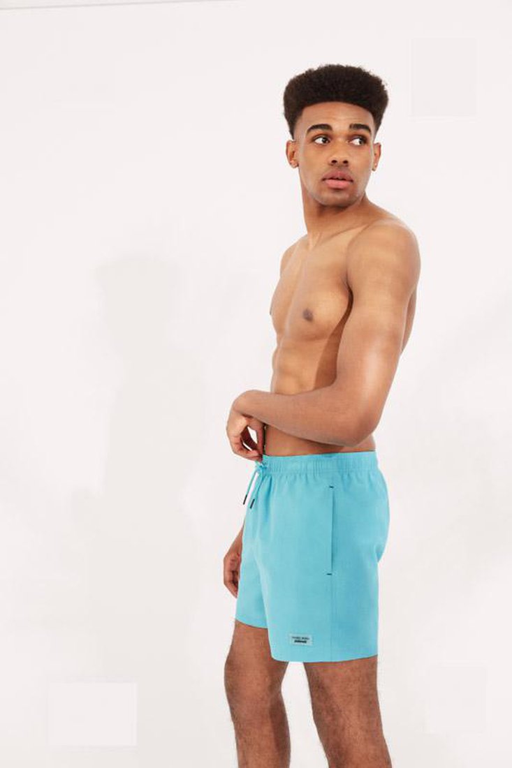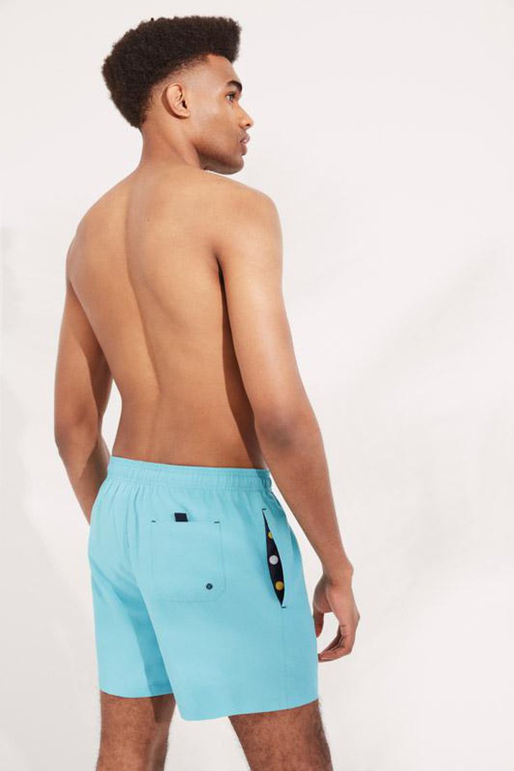 Bañador de hombre con tejido de secado rápido. Cintura elástica con cordón de ajuste. Modelo liso en color turquesa con detalle de lunares multicolor en el interior de los bolsillos laterales.