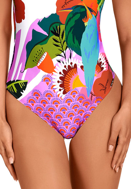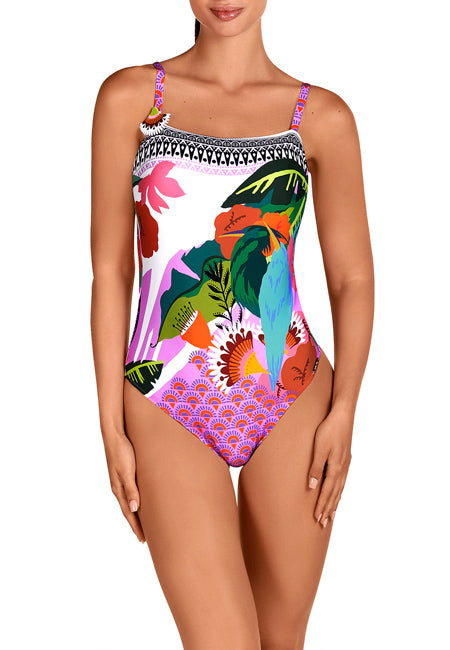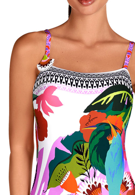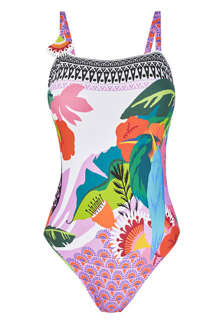 Bañador colección Pasarela Dolores Cortés, estampados florales en colores vibrantes, escote recto, tirantes anchos, aplicación en plástico en un tirante, que añade detalles al bañador.