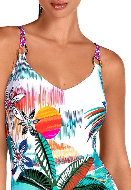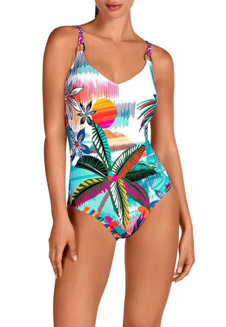 Bañador sin aros con estampado tropical sobre fondo blanco Dolores Cortés