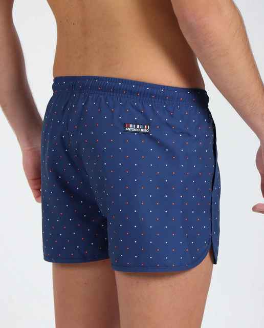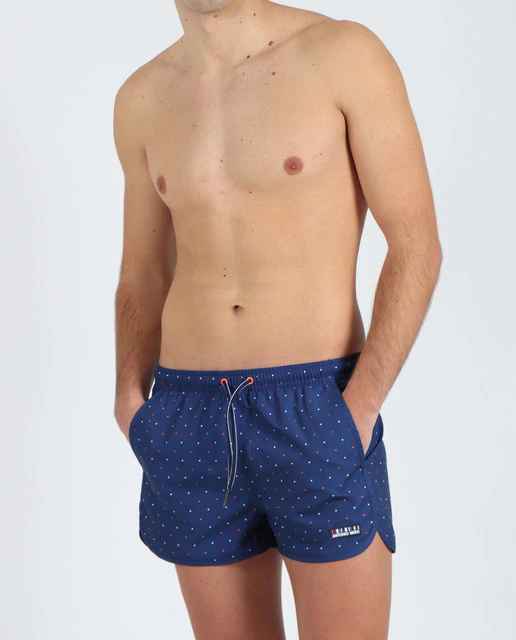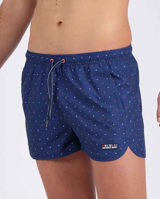 - Bañador de hombre en tejido de secado rápido, color azul marino con estampado de pequeños puntos en color blanco y rojo.