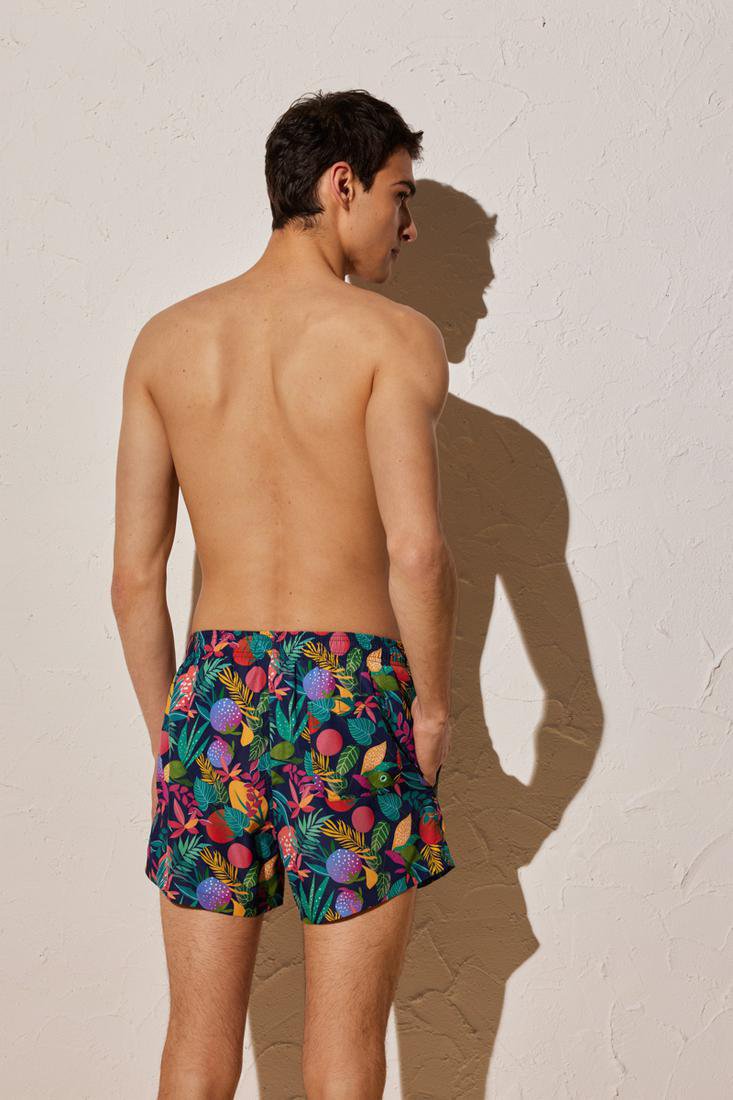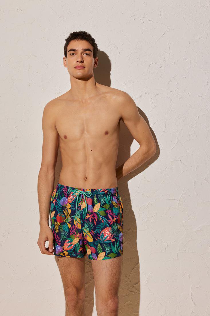 Bañador estampado corto de secado rápido. Tejido Ligero y estilo Tropical. Cordón en cintura con el que ajustar la prenda a la silueta. Suspensor interior en suave malla para un confort total. Bolsillos laterales y traseros con evacuadores de agua.