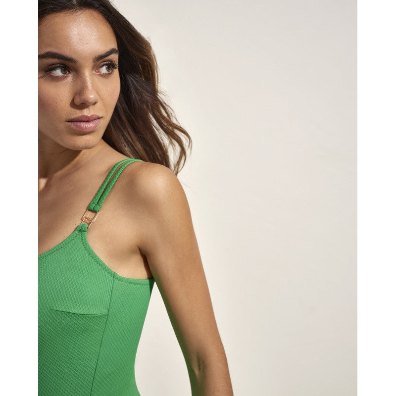 Bañador de mujer de escote alto cuadrado con tirantes multiposición. Con copa interior y sin aro.