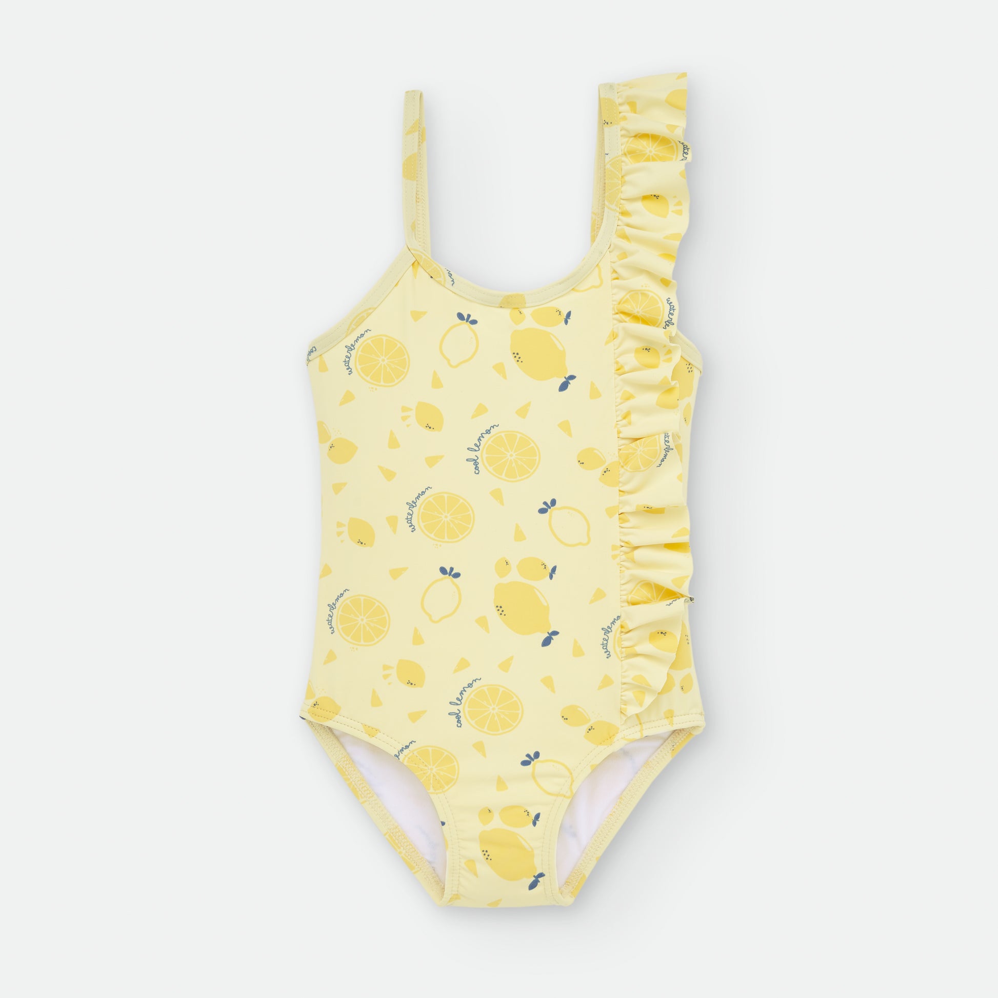 Bañador para bebé y niña estampado "Limones". Tiene tirantes asimétricos y un volante vertical en uno de los laterales. Escote alto en la espalda para proteger del sol.