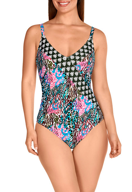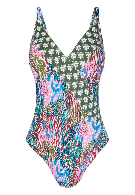 Bañador reductor estampados combinados con frontal cruzado Dolores Cortés