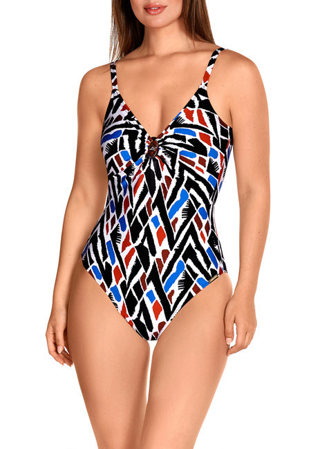Bañador REDUCTOR de mujer estampado en tonos azules muy vivos. Top interior para sujetar el pecho, escote de pico con detalle metálico en el centro. Escote en la espalda medio, laterales pulidos. Tirantes regulables.