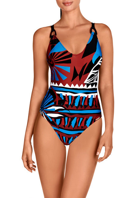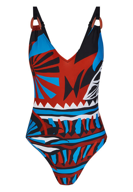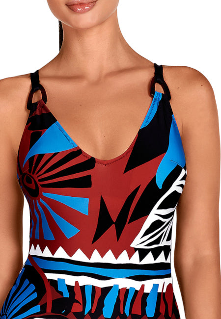 Bañador reductor estampado en tonos tierra y azules super favorecedores. No lleva aros pero lleva top interior que sujeta el pecho. Tirantes regulables en altura que se cruzan en la espalda. Estampado posicional que estiliza ópticamente la figura.