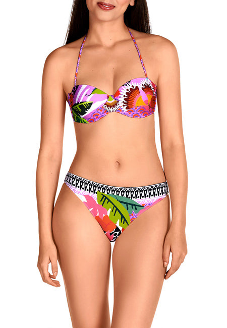 Bikini con escote bandeau, de la colección Pasarela de Dolores Cortés. Top con aros que realza y se ajusta al contorno perfectamente y bragas de talle medio en un estampado posicional precioso.