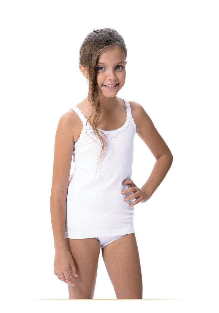 Camiseta de niña de algodón con tirante fino y una fina puntilla elástica en los tirantes y rodea el escote. Pequeño lazo en el centro del escote en el mismo color que la camiseta.