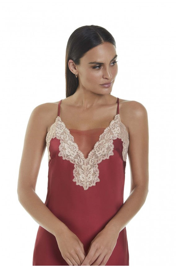 Camisón lencero con tirantes finos, super sensual, con superposiciones de encaje de estética ultra cuidada. Un diseño exclusivo que se caracteriza por la sofisticación y delicadeza, y se convierte en una prenda única y especial.