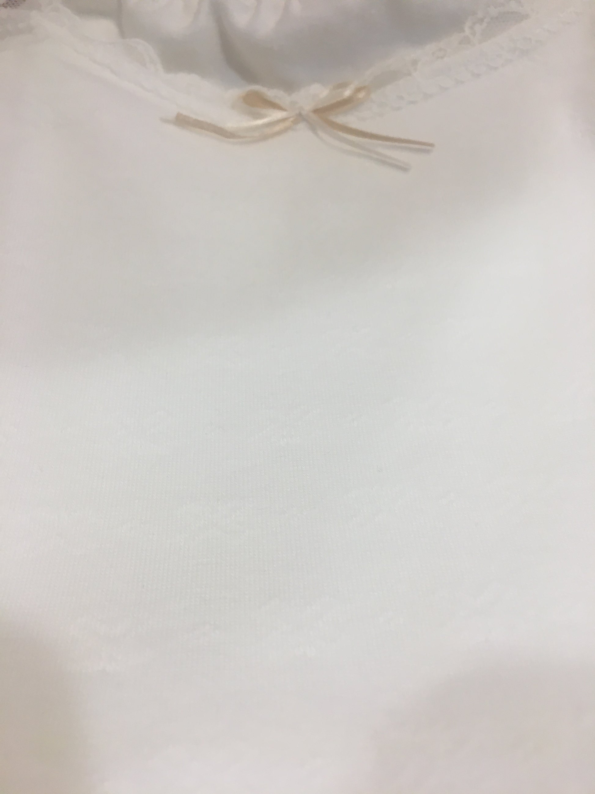 Como detalle decorativo, lleva una lazada muy fina en dos tonos, crudo y beige y una fina puntilla bordeando el escote que hace la camiseta muy lencera y no pica.