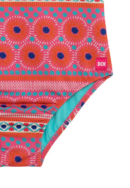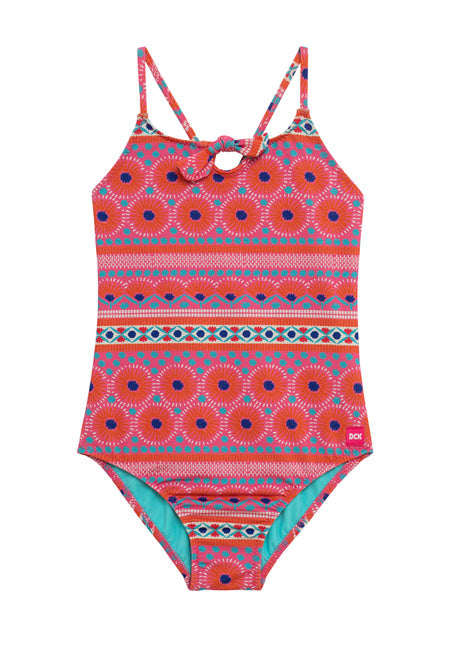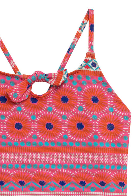 Bañador de niña estampado en tonos fucsia y azules con un toque muy étnico, con tirantes finos y escote camiseta. Lleva la espalda escotada y va completamente forrado en color azul.