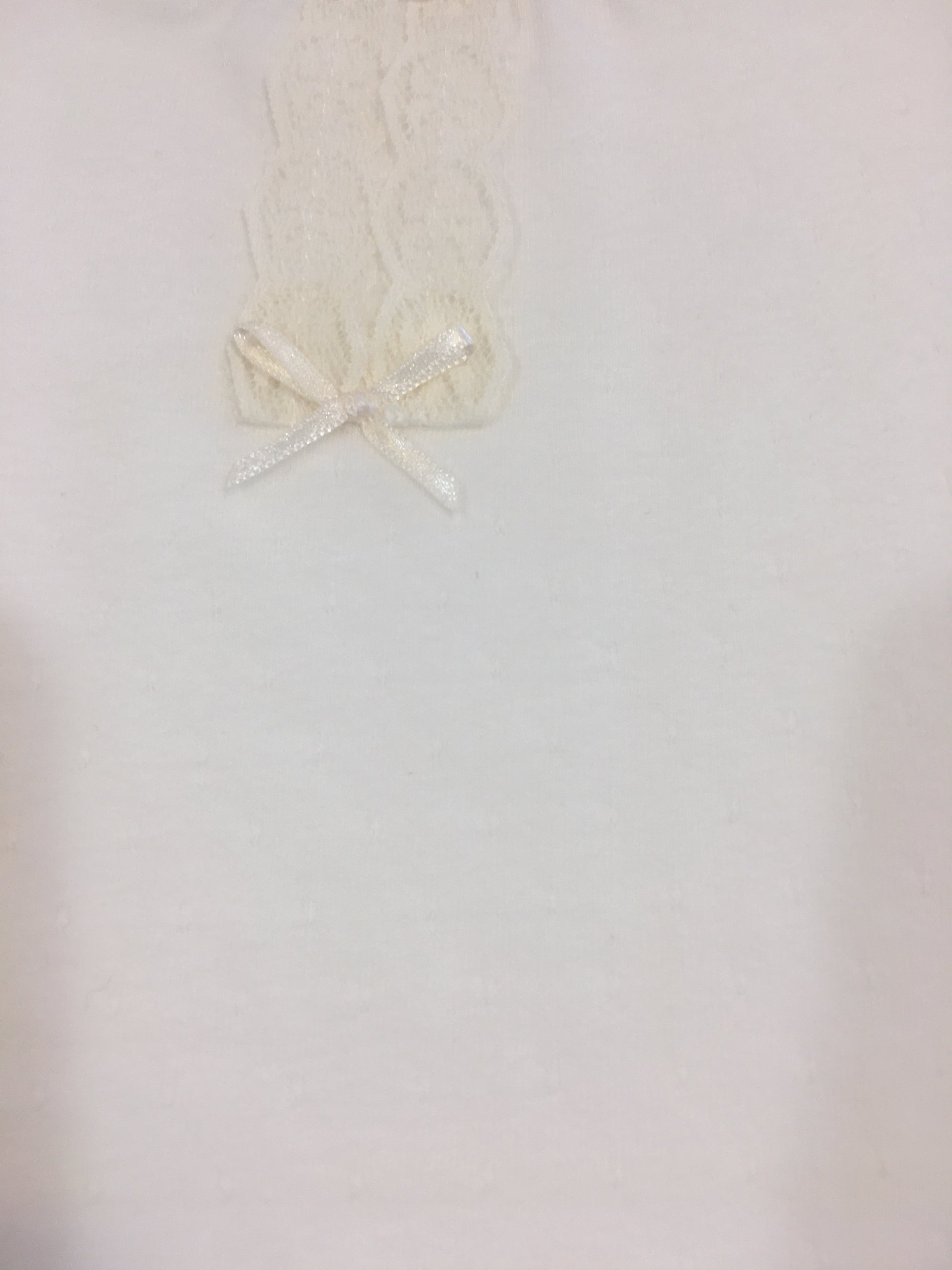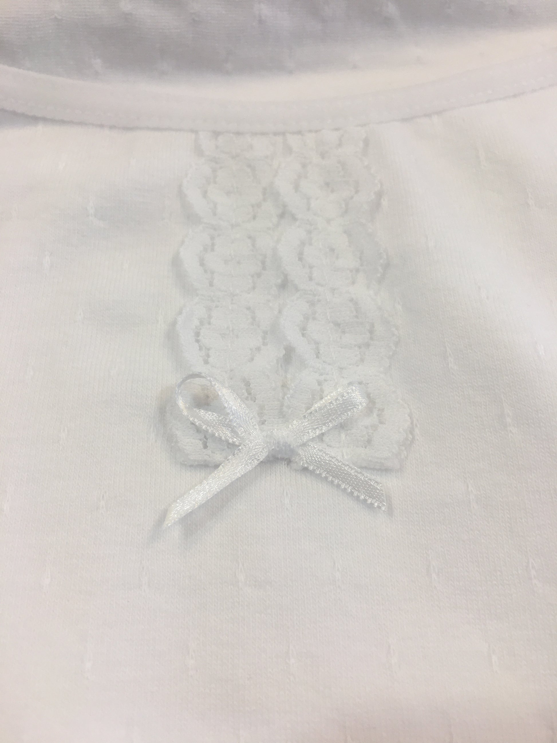 Como detalle decorativo, lleva un pequeño adorno de encaje con un mini lazo a juego en el centro del escote de la camiseta.